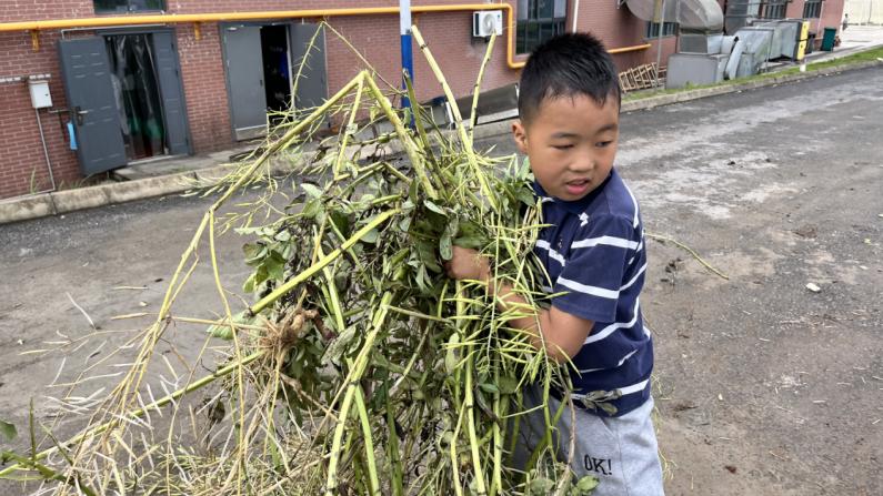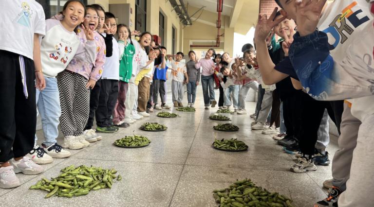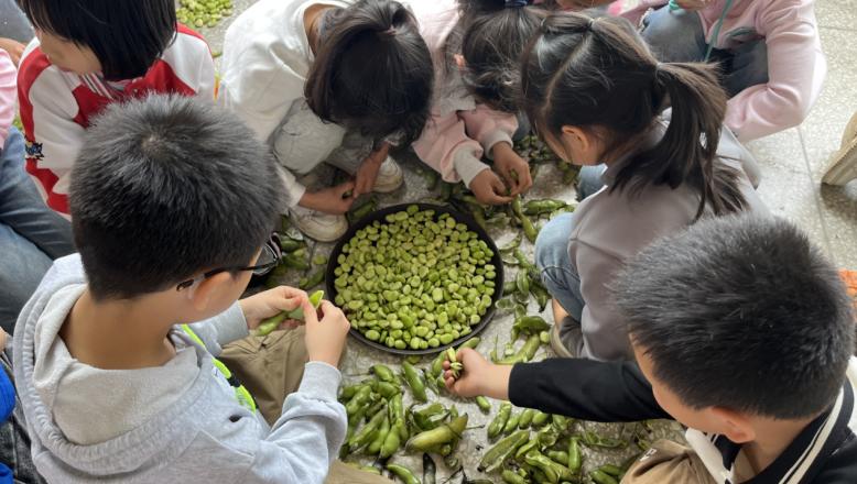 采摘结束后,南溪区长江学校三年级(4)班的学生们将胡豆角搬运至教室外走廊。随后,全班默契分工,开启剥胡豆工序:有的同学专注掰开豆荚,有的则小心翼翼将圆润的豆子剥离。双手翻飞间,豆粒簌簌落入筐中,此起彼伏的讨论声与欢笑声交织,现场一派热火朝天的劳动景象。在协作中,孩子们不仅掌握了剥豆技巧,更在相互配合中体会到团队力量,收获了劳动带来的成就感与喜悦。