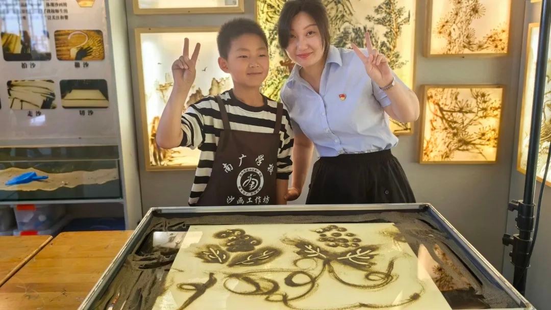 移步至沙画坊,暖黄灯光下,学生们正专注地用指尖勾勒沙画作品。现场,参观者跟随学生体验基础沙画技巧,在流动的沙粒中感受传统文化与现代艺术碰撞的奇妙。