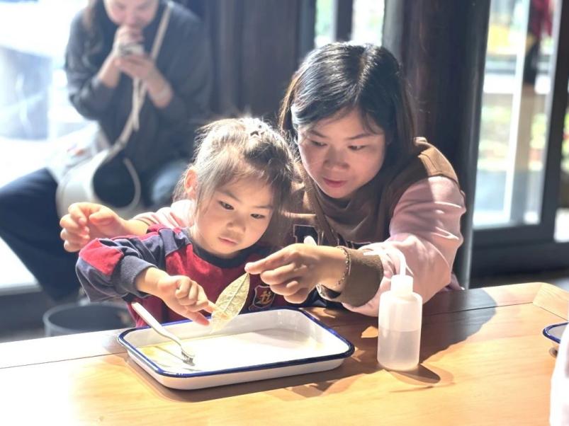 “老师,我的叶子变成透明啦!”在童趣院里,孩子们用刷子轻轻刷去叶肉,留下清晰的叶脉,再染上五彩的颜色,一张张独一无二的叶脉书签诞生啦!既学到了植物知识,又收获了动手的快乐~
