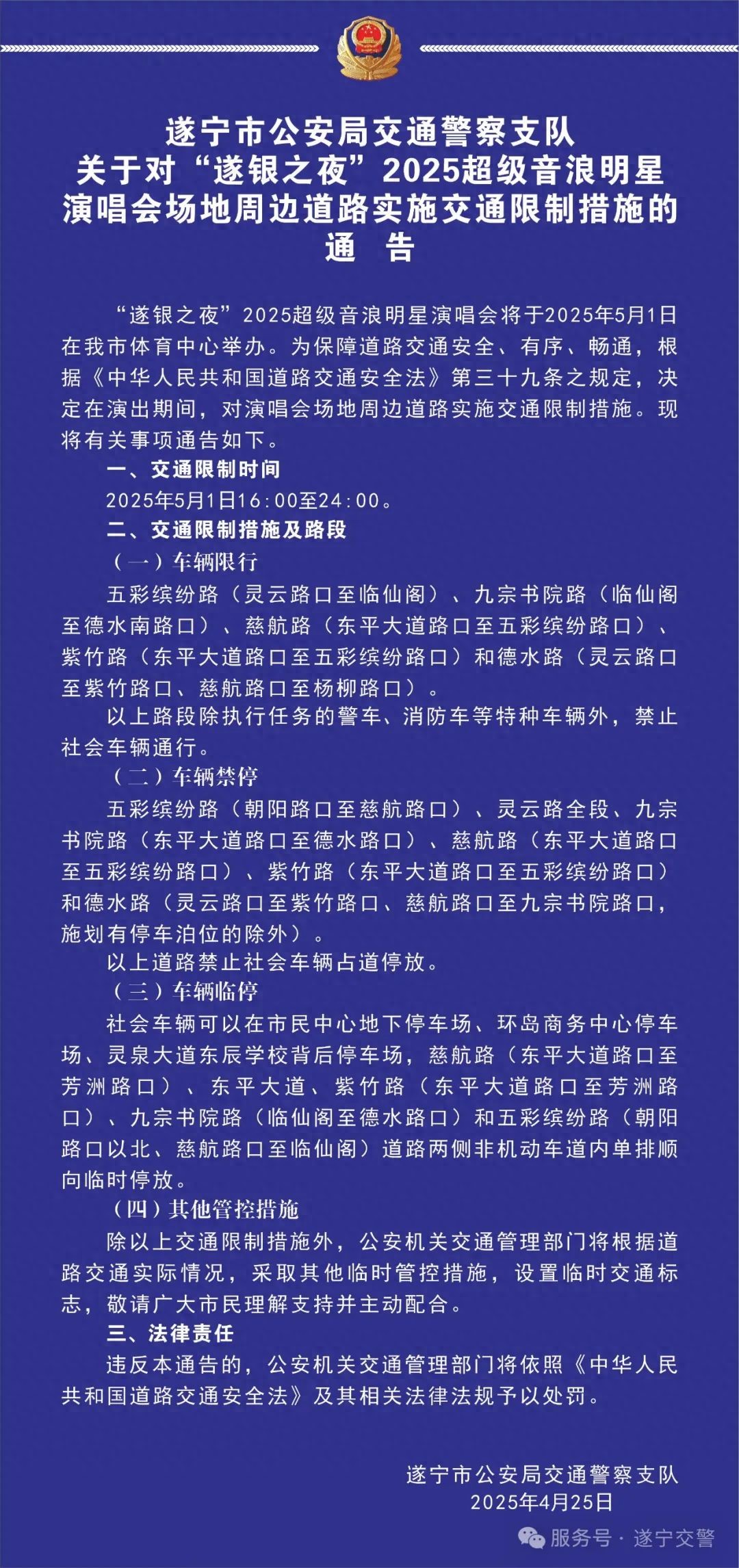 “遂银之夜”2025超级音浪明星演唱会将于2025年5月1日在我市体育中心举办。为保障道路交通安全、有序、畅通,根据《中华人民共和国道路交通安全法》第三十九条之规定,决定在演出期间,对演唱会场地周边道路实施交通限制措施。现将有关事项通告如下。