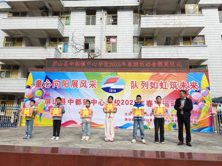 赛事结束后,屏山县中都镇中心学校举行了颁奖典礼。廖校长及校领导为获奖班级和个人颁发奖状及荣誉证书。在运动会中表现优异的同学手捧奖状,脸上洋溢着自信的笑容。颁奖现场掌声雷动,欢呼声与喝彩交织,将运动会推向又一高潮。