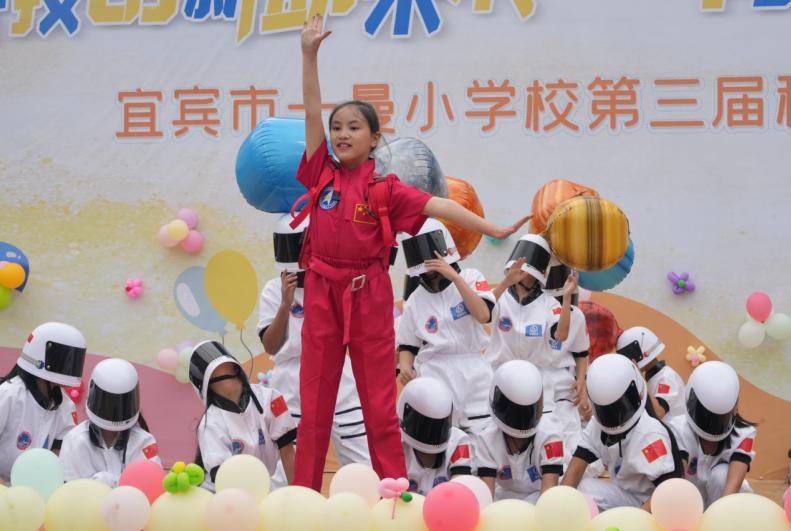 艺术展演环节高潮迭起。宜宾市一曼小学校德铭校区六年级(二)班的舞蹈《爷爷奶奶和我们》拉开了帷幕。随后舞蹈、情景剧、合唱等节目轮番登场。三年级二班的舞蹈《遨游太空》似在告诉大家,航天梦想的火焰代代相传,孩子们出色的表演赢得满堂喝彩。
