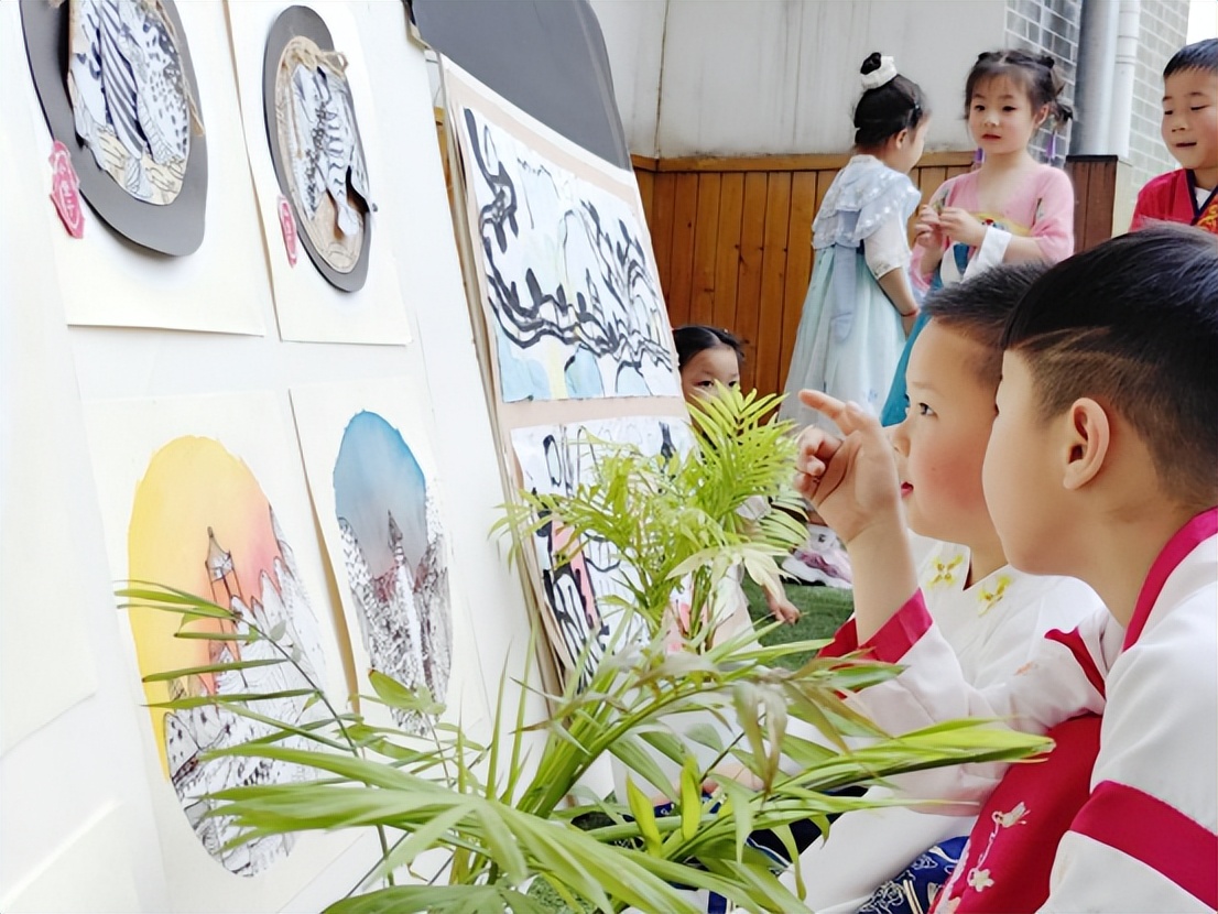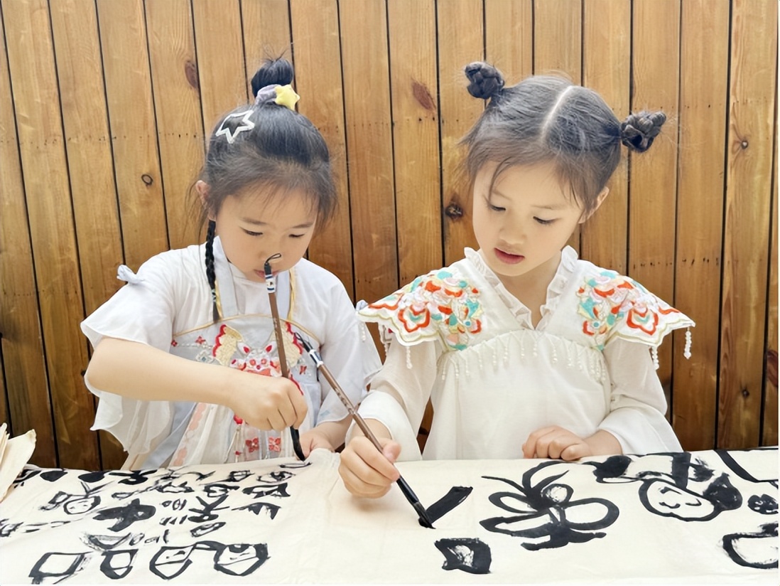 诗会当日,园内亮点纷呈。走进诗画长廊,孩子们用蜡笔、水彩、拼贴等形式创作的诗画作品琳琅满目,“两个黄鹂鸣翠柳”“飞流直下三千尺”等诗句在孩子们的笔下鲜活呈现。在书写区,孩子们手握毛笔、彩笔,书写“清风”“明月”,绘制春和景明,种下品格种子。手势舞环节,孩子们通过灵动的舞姿,让诗词从纸间跃出。童声诵读时,《悯农》《游子吟》《读唐诗》等诗词被孩子们用清亮的声音唱响,传递珍惜、感恩之情。