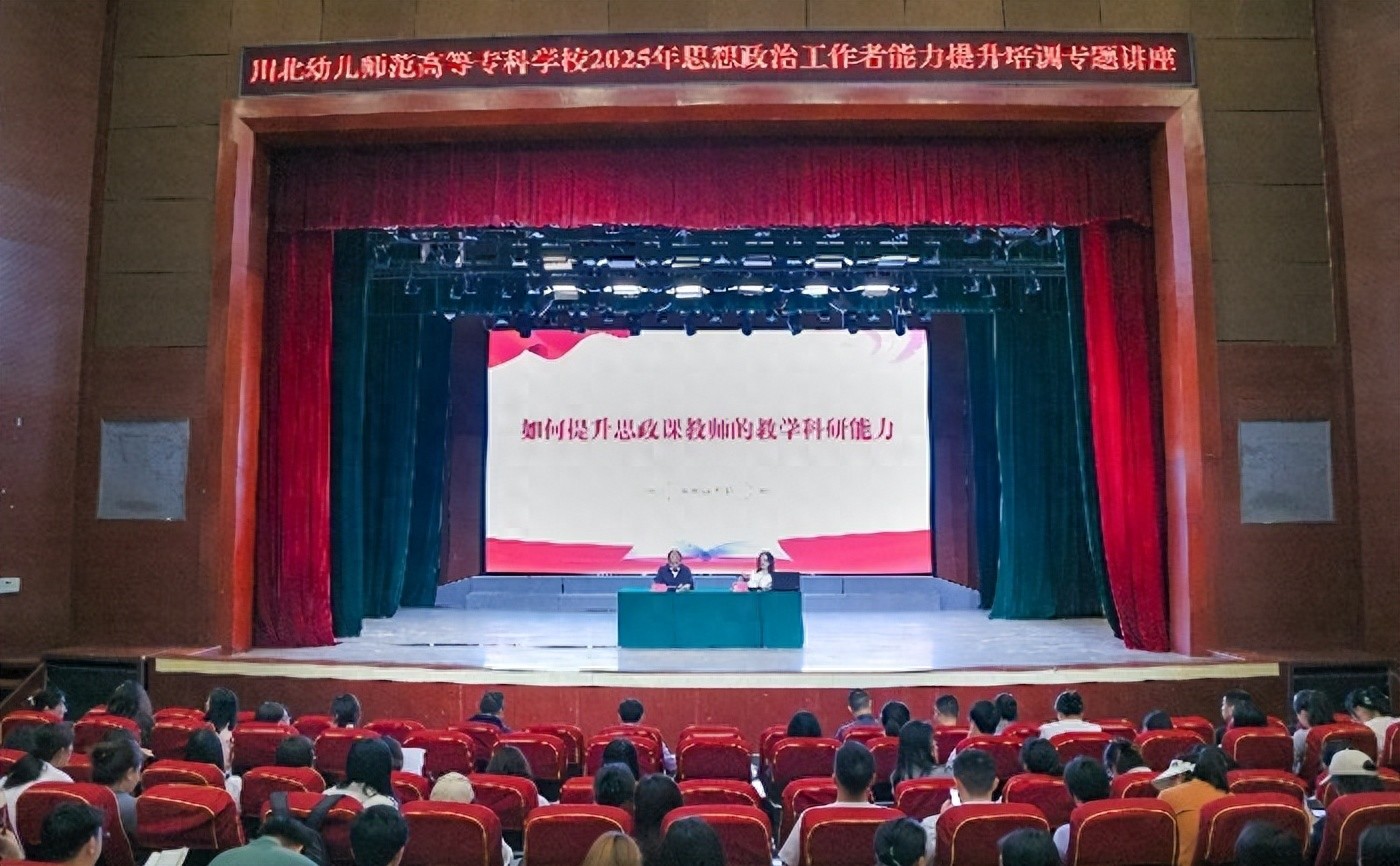 4月28日,川北幼专在开明艺术楼演播厅举办2025年思想政治工作者能力提升培训专题讲座。川北幼专党委副书记、校长冯莎为学校教师代表作题为“如何提升思政课教师的教学科研能力”的专题辅导报告。讲座由校党委副书记李成保主持。