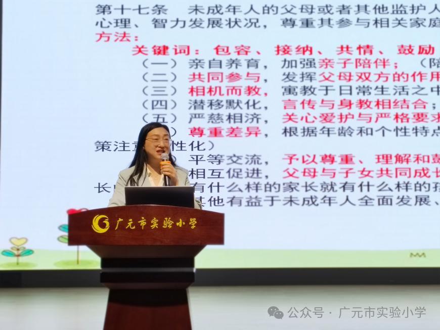 微风携雨意,共育有温情。4月26日,广元市实验小学“家长学堂”系列讲堂第四期课程《小学低段的家教赋能》精彩开讲。本次活动围绕小学一、二年级学生成长关键期展开,旨在与家长共同探讨科学的家庭教育方法,搭建家校沟通桥梁,促进家庭教育与学校教育同频共振,凝聚合力,为孩子的成长奠定坚实基础。