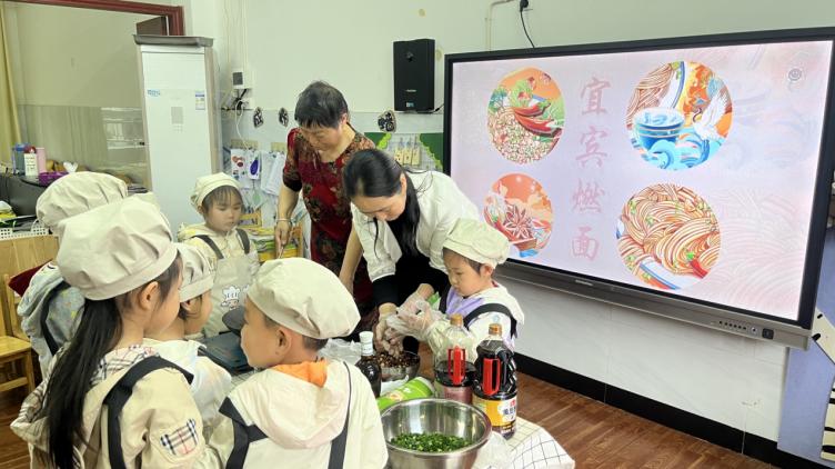 叙州区高场镇中心幼儿园中一班家长走进课堂,带领孩子们体验宜宾非遗美食——燃面的制作。活动中,家长教孩子们炒花生米、煮面、拌调料,孩子们体验劳动乐趣,感知家乡饮食文化,家长与教师共同引导孩子们在动手实践中传承非遗技艺,增进亲子协作,让一碗热气腾腾的燃面成为教育与温情交织的成长记忆。
