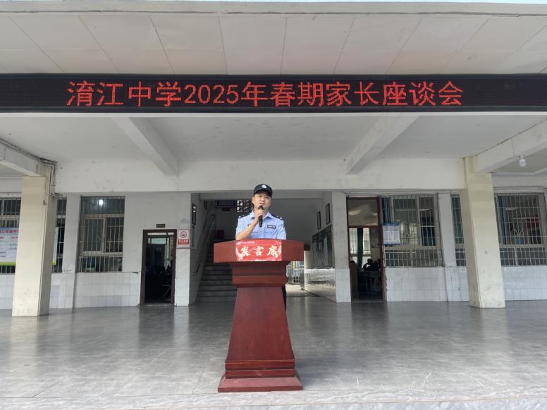 随后,江安县淯江初级中学校法治副校长蒋民毅进行了安全教育专题讲座。他结合近期案例,深入浅出地讲解了防溺水、防性侵、防电信诈骗以及道路交通安全等方面的知识。蒋民毅的讲座引发家长的强烈共鸣。