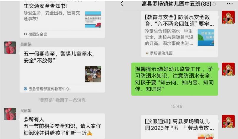 为形成家园教育合力,高县罗场镇幼儿园借助班级微信群、公众号推送五一假期安全温馨提示,详细列举假期各类安全注意事项,如出行交通安全、居家防火防电、饮食卫生等,提醒家长切实履行监护职责,加强对幼儿的安全教育与监管。