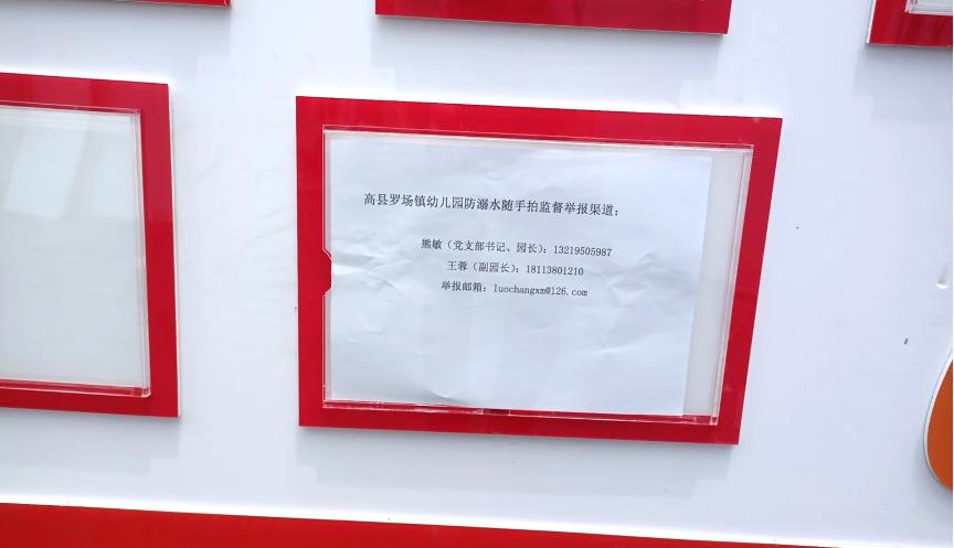 高县罗场镇幼儿园认真排查校园周边水域隐患,在公示栏张贴防溺水随手拍有奖举渠道,确保重点、危险水域设置完善安全防护设施和警示牌,定期开展排查工作,发现问题及时与镇政府、社区沟通反馈,将防溺水安全工作做实、做细,落在实处。