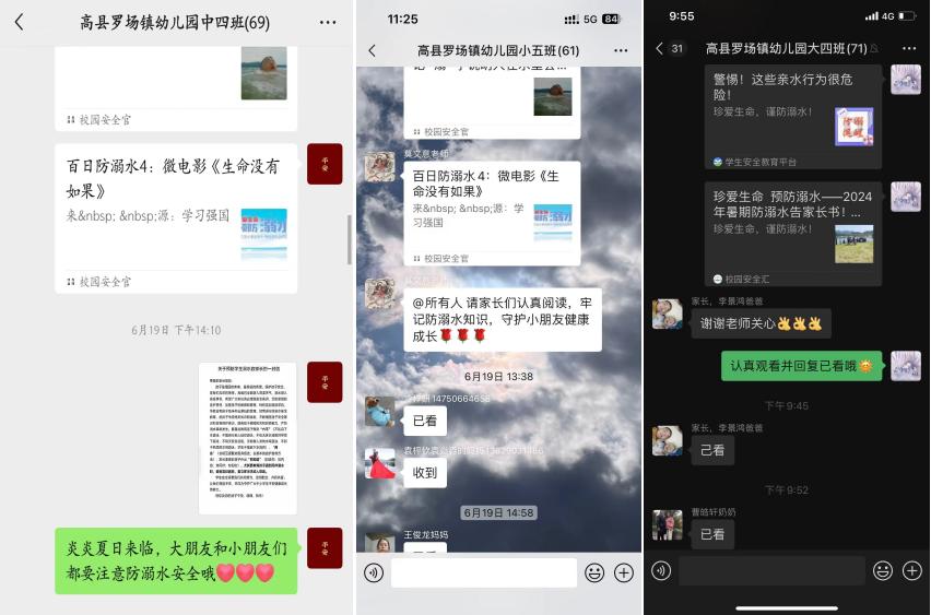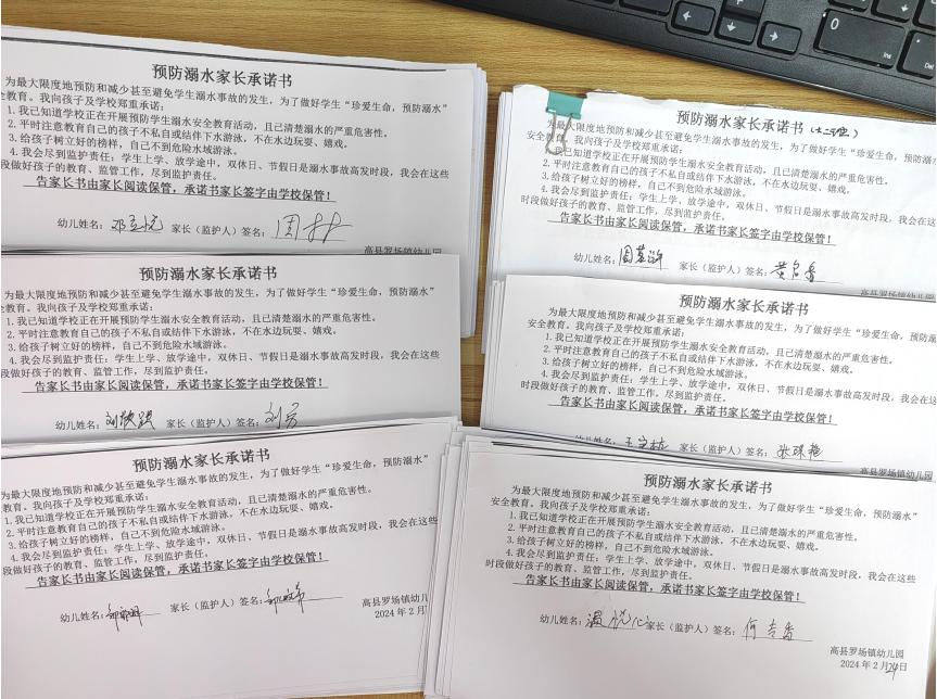 高县罗场镇幼儿园各班通过转发《高县教育和体育局2024年暑假安全致家长一封信》《预防未成年人溺水法定监护责任告知书》《防溺水致家长的一封信》;通过签订防溺水《家长承诺书》向家长宣传防溺水的各项安全措施,增强家长的安全意识和监护意识,切实承担起监护责任,加强对幼儿的教育和监管,严防意外事故的发生,绷紧防溺水这根弦。