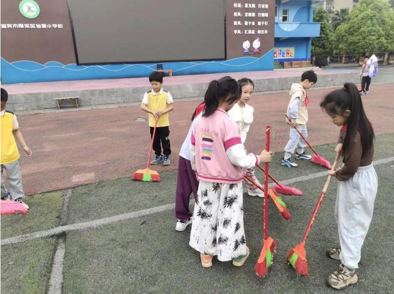 活动当日,阳光轻柔洒落校园。南溪区仙源小学校三年级同学们在老师带领下齐聚操场,眼神满是期待,手持扫帚、簸箕等工具,准备为校园“梳妆”。