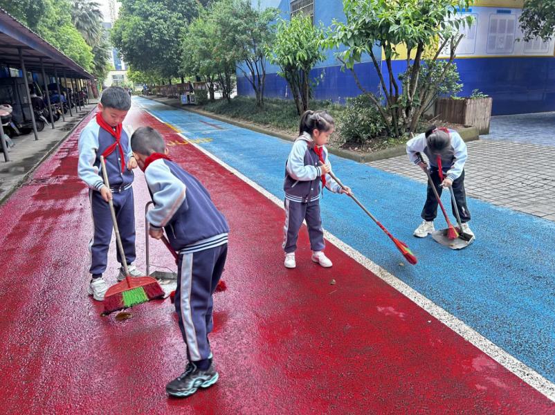 另一组“校园美容师”则承包了学校车棚及过道清洁。他们用扫帚将落叶打扫干净,连车棚缝隙里的烟头也被“火眼金睛”一一检出。孩子们一边打扫一边说:“这里亮堂堂的,路过的老师和同学心情也会变好吧!”细雨中,孩子们依然干劲十足,勾勒出劳动最美的剪影。