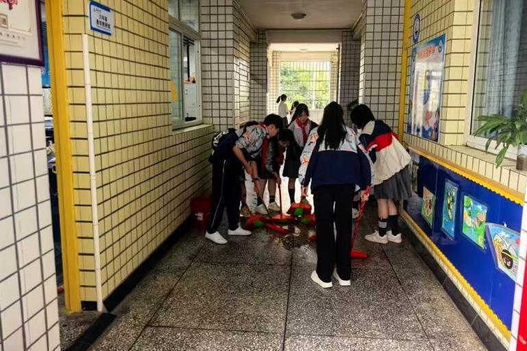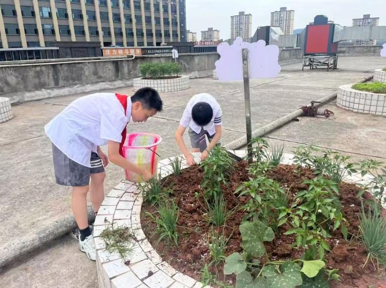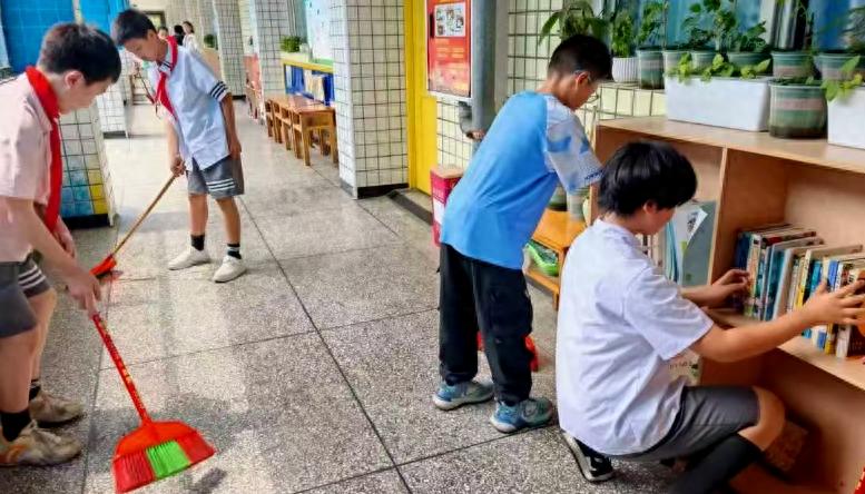 在教室外的走廊,同学们分工协作,手持扫把、拖把和抹布,不放过任何一个角落。抹布擦过瓷砖的滋滋声中,他们踮着脚擦拭高处墙缝,连窗台积灰的角落都被棉签仔细清理干净。劳动基地里更是一派热火朝天的景象:有的弯腰拔除杂草,额前碎发被汗水粘在脸颊;有的提着水壶给菜苗浇水,水珠在阳光下折射出晶莹的光。每一次弯腰、每一次擦拭,都让劳动带来的愉悦与成就感在他们心中悄然生长。