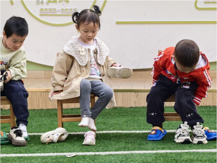 小班宝贝们蹲在地上,捏着鞋子喃喃自语,阳光透过树叶在她翘起的睫毛上跳跃。当她把小脚丫成功塞进正确的鞋洞时,全场响起热烈的掌声。