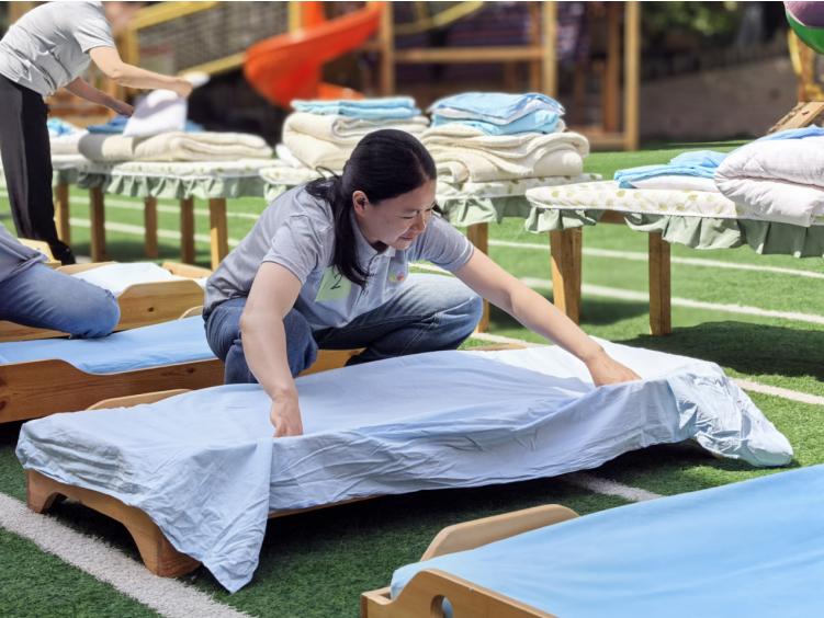 劳动节比赛现场,三江新区双城中心幼儿园保育老师们大显身手!她们温柔地为幼儿梳起精致发型,手法娴熟;又快速将被子、枕头叠放得方方正正、整整齐齐。每一个动作都尽显专业,在细微处彰显保教荣耀,将保育工作的细致入微展现得淋漓尽致。
