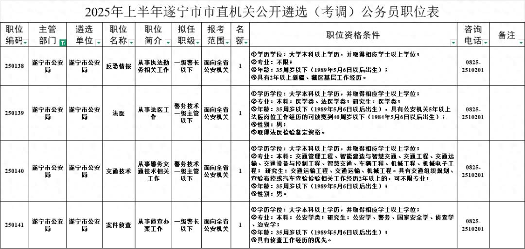 其他职位面向遂宁市内机关(单位)已进行公务员(含参照公务员法管理机关<单位>工作人员,下同)登记且在编在岗符合条件的公务员遴选(考调)。中央机关、省级机关设在遂宁市内的单位(包括垂直管理单位、派出单位等)中符合条件的人员也可报考。
