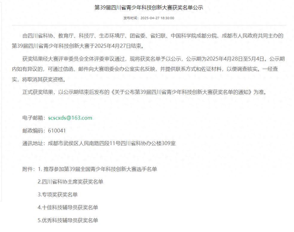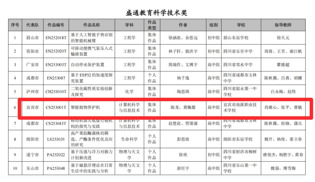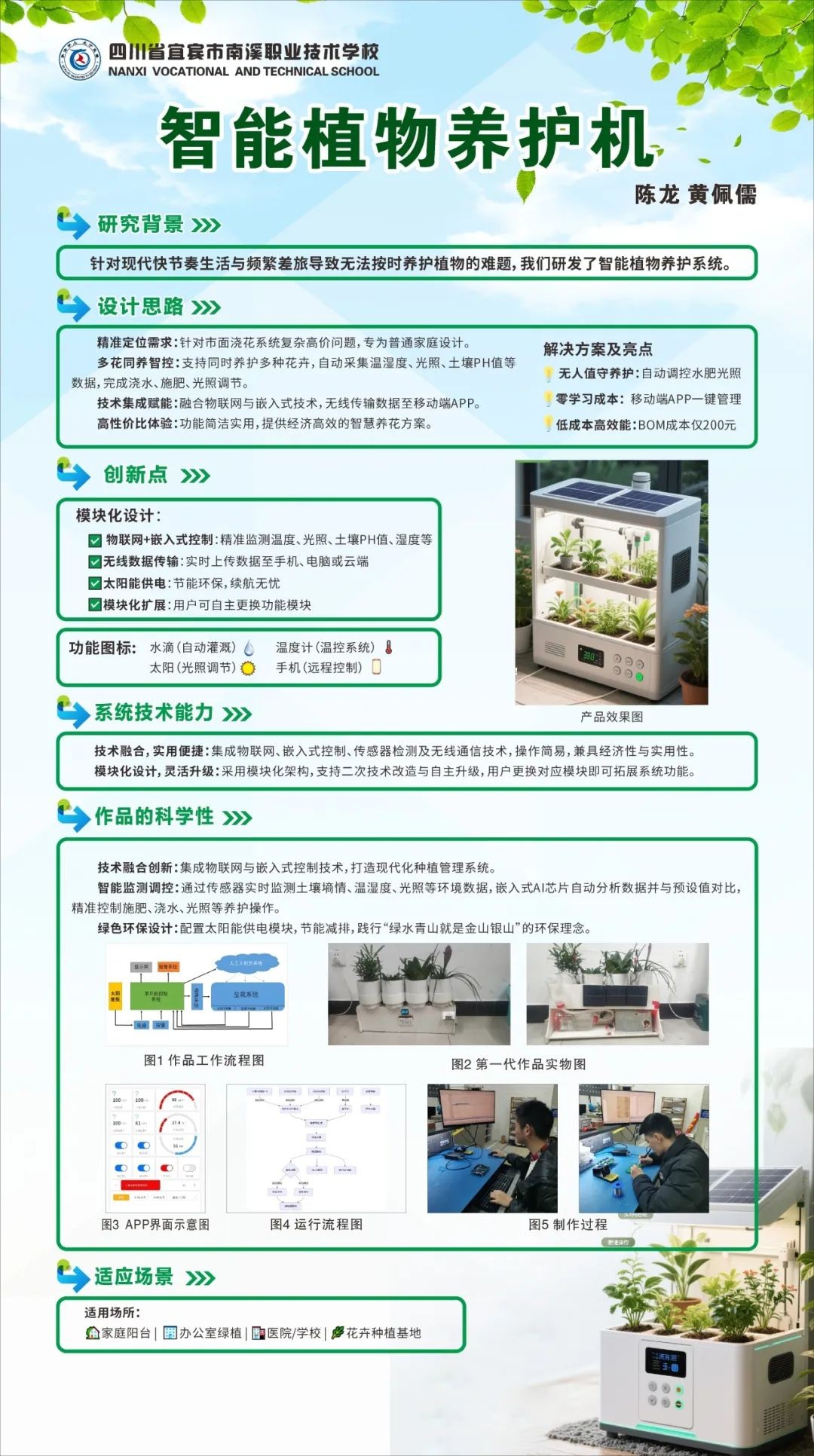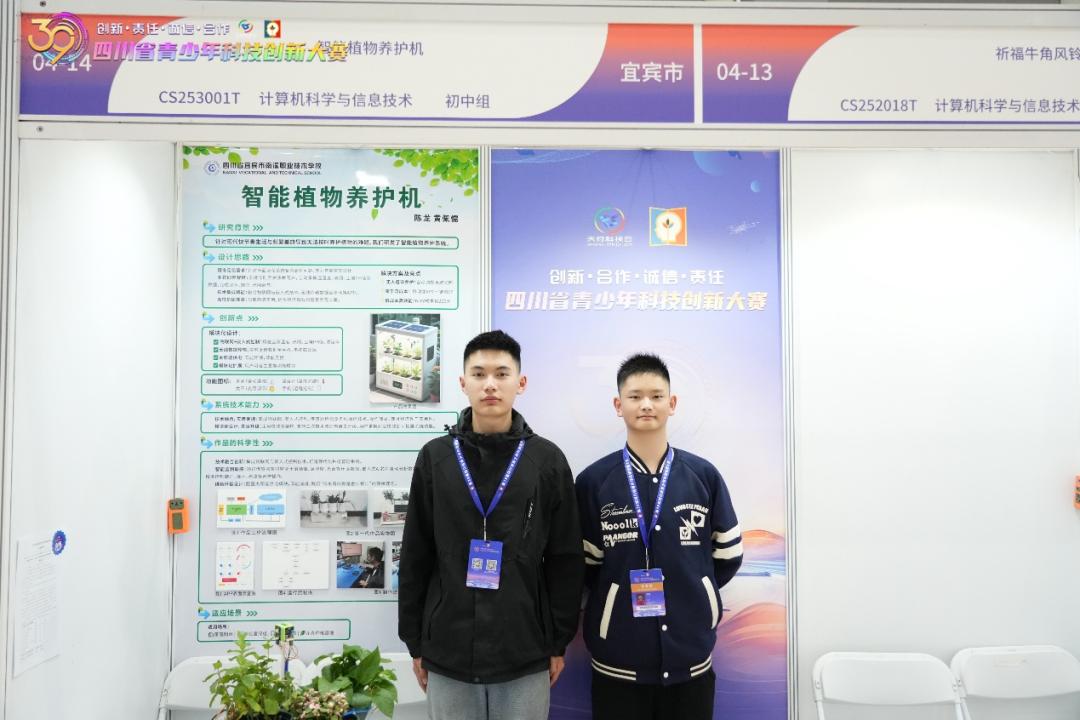 近日,第39届四川省青少年科技创新大赛在成都七中东部学校举行。大赛吸引了全省21个市(州)的422名科技少年和80名科技辅导员参赛,共展出青少年科技创新作品315项、科技辅导员科技教育创新作品80项。宜宾市南溪职业技术学校电子技术应用专业2023级1班陈龙、黄佩儒同学自主研发的科技创新作品《智能植物养护机》从全省315项科技作品中强势突围,斩获大赛专项奖“盛通教育科学技术奖”,并获得奖学金1000元以及价值2000元的智能机器人创新实践套装!