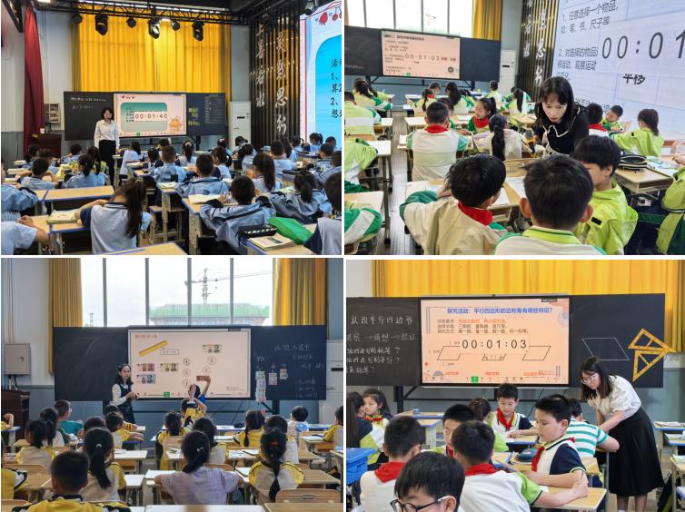 刘芳老师执教《运算律的复习》,以“思维导图构建+闯关任务链”串联知识体系,引导学生自主归纳运算规律,培养结构化思维;贺燕老师的《平移和旋转》一课,借助生活中的实际场景和直观的教具演示,帮助学生理解抽象的平移和旋转概念,让学生在观察与操作中感受数学与生活的紧密联系;刘忠明老师创设情境教授《认识人民币》,让学生在实践体验中认识人民币的面值和换算,培养了学生的数学应用意识;罗庆艺老师执教《认识平行四边形》,采用“猜想-验证-建模”三步探究法,学生通过动手测量验证发现图形特性,建构空间观念;罗秀老师《100以内进位加法》采用循序渐进的教学方式,结合直观的计数器和小棒演示,帮助学生理解进位加法的算理,让学生轻松掌握计算方法;雷停停老师《平面图形的周长和面积的整理与复习》逐步的问题引导,小组交流,回顾整理公式的推导过程,感悟数学转化思想和数学推导能力,建立平面图形之间的知识结构图。