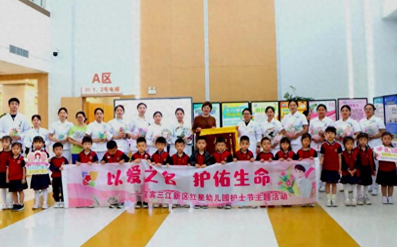随后,园长妈妈代表三江新区红星幼儿园向护士们赠送了一面特别定制的锦旗,她动情地说道:“感谢每一位护士用专业与温暖守护生命,你们是孩子们心中最闪亮的榜样!”护士们接过锦旗,眼中泛着感动的泪光,现场响起热烈的掌声。
