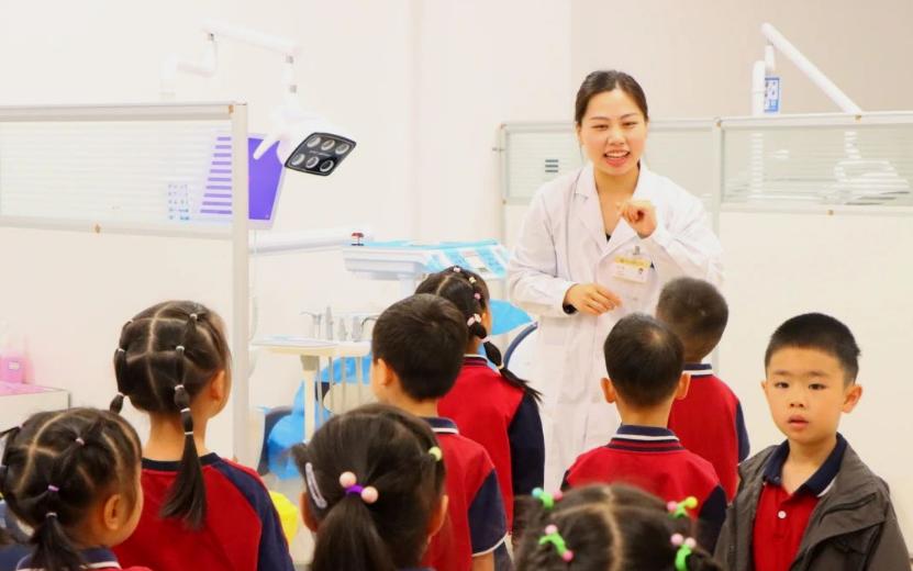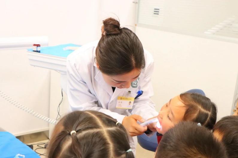 护士阿姨用牙齿模型示范“圆弧刷牙法”,还邀请小朋友上台模拟刷牙,孩子们争先恐后地举手参与,课堂充满欢声笑语。