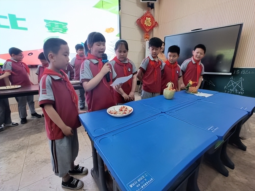 完成作品后,每位学生需上台解说创作思路。孩子们落落大方地介绍着自己给作品取的名字用了哪些水果,寓意是什么。“我用火龙果模拟火山,橙子片拼成太阳,希望表达自然的力量!”评委从创意、协作、表达三方面评分,最终评选出“特等奖”“一等奖”“二等奖”等多个奖项。