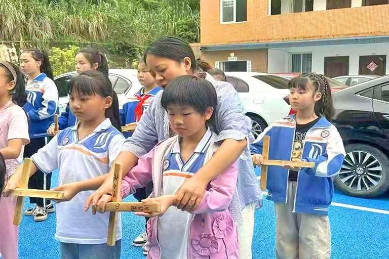 夏丽均一边和学生们一起学习金钱板,一边在音乐课和学校开设的特色课堂上带着孩子们继续巩固相关技艺。“最初接触金钱板,感觉很难。”夏丽均摊开手掌让记者看,说最开始学习的一段时间,因为掌握打板的技巧不易,手上全是血泡,到了后面则起了厚厚的茧。唱腔上,因为金钱板没有固定的谱,属于口口相传,对于老师教学内容的掌握程度便显得格外重要。掌握了金钱板基本的要领后,夏丽均在学校开设了相关课程,让非物质文化遗产浸润孩子们的日常生活。慢慢地,孩子们也对这门之前很是陌生的艺术门类产生了浓厚的兴趣。