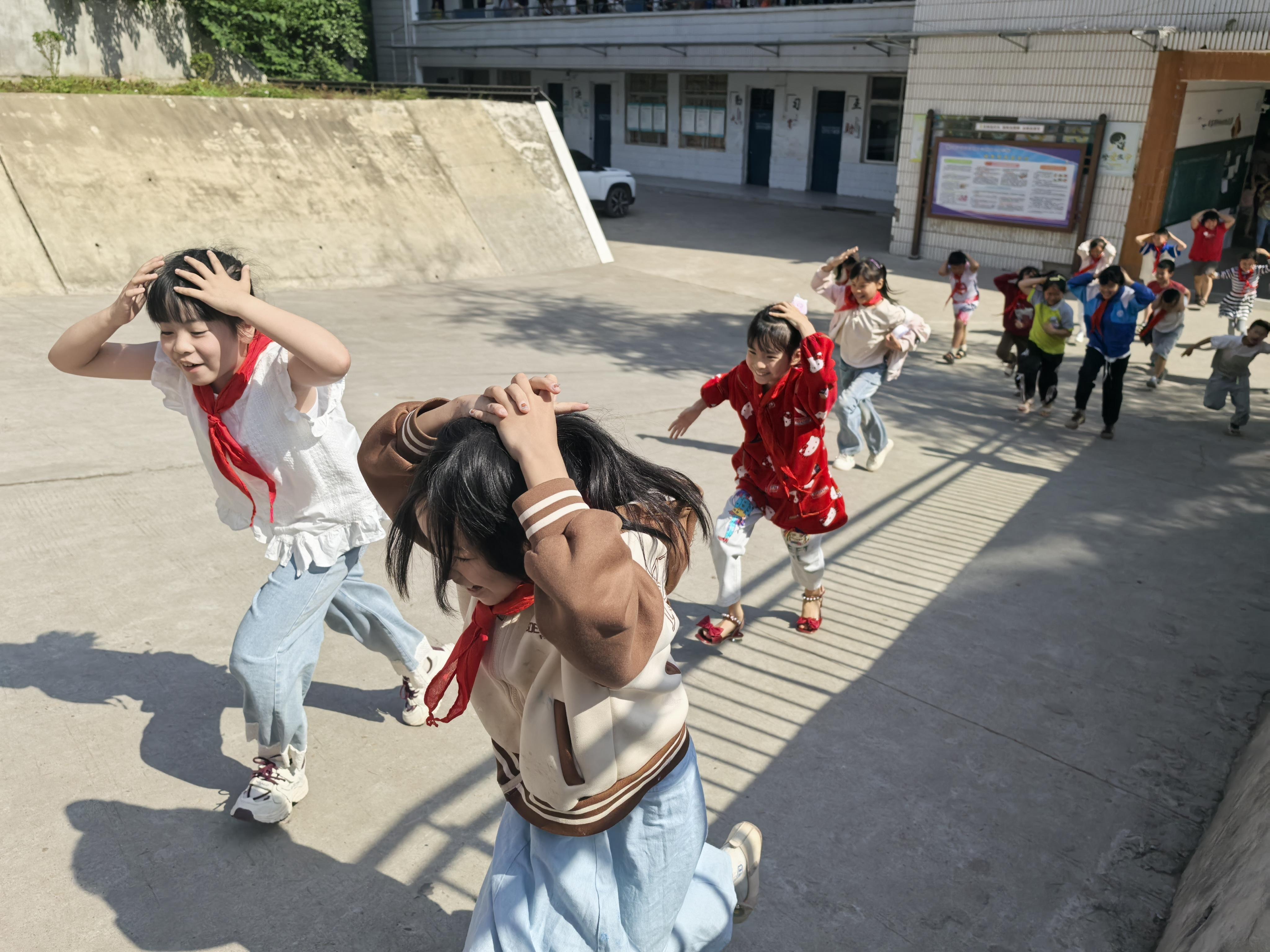 演练中,各点位负责教师提前各就各位,当学校广播防空警报声响起,各班教师迅速组织学生按照既定路线紧急撤离,同学们双手护头,小步快跑,全校500余名师生用时1分12秒全部安全撤离到学校操场,各班再次清点人数,所有学生全部安全到场。