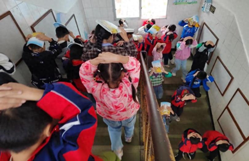 随着第一次警报声响起,地震应急演练正式开始。教室内,学生们迅速就近躲避,有的躲在课桌下,有的用书包护住头部蜷缩在墙角,以规范的姿势进行紧急避险。约1分钟后,第二次警报声响起,南溪区黄沙镇中心小学校各班教师迅速组织学生有序撤离教室。学生们按照预定疏散路线,弯腰、捂头,快速且安静地向操场等安全区域疏散。整个过程紧张有序,仅用时2分钟,全体师生便安全到达指定位置。