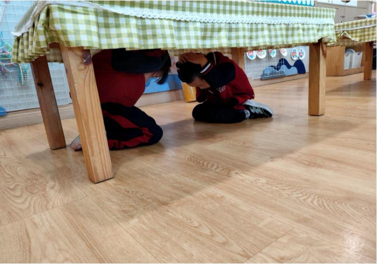 随着第一声警报声骤然响起,正在开展各项活动的孩子们根据学到的逃生演习经验,迅速作出反应。在三江新区红星幼儿园老师的引导下,他们迅速就近躲在桌子下、墙角处,用双手护住头部,蜷曲身体,降低重心,等待“地震”过去。