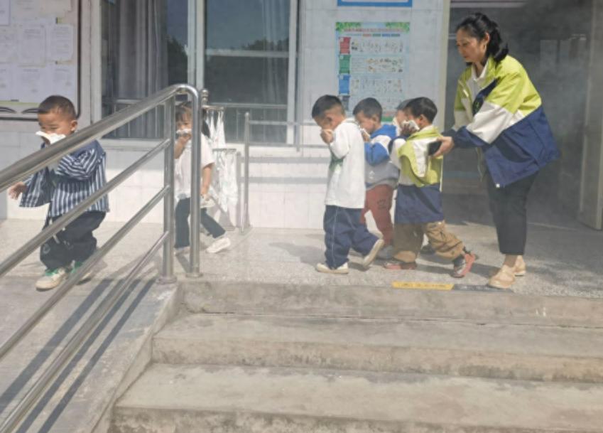 随着急促的消防警报声响起,演练正式开始。南溪区南溪街道中心幼儿园各班教师引导幼儿用湿毛巾捂住口鼻,弯腰低姿态,按照预定疏散路线,快速、有序地撤离至操场安全区域。演练结束后,该园安保主任通过生动的案例讲解,向师幼普及火灾预防、报警方法及灭火器使用技巧。