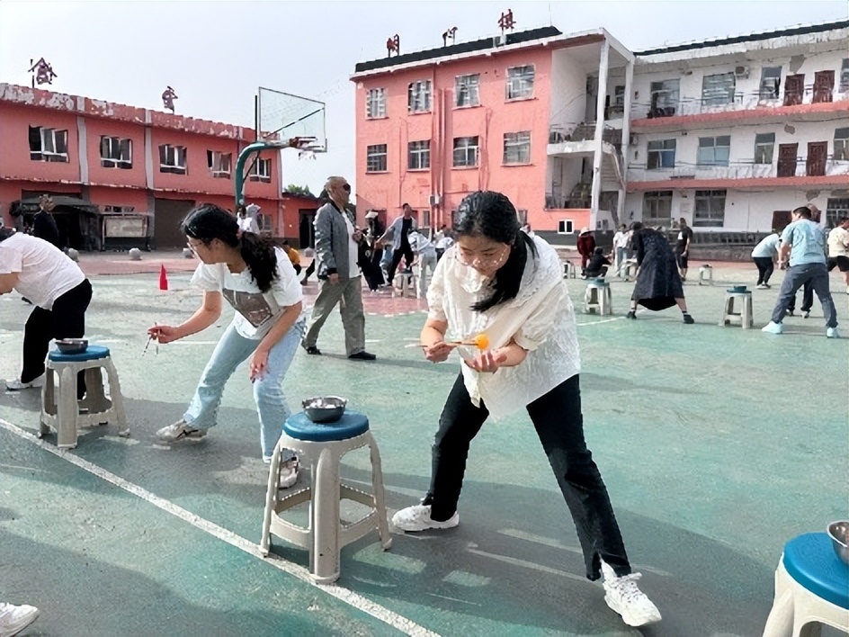 筷子夹乒乓接力的项目最是考验耐心与技巧,比赛场上老师们一个个凝神静气,秉持着“快、准、狠”的原则,用筷子夹起乒乓球进行灵活的传递。最终九年级参赛教师凭借稳健发挥摘得桂冠。