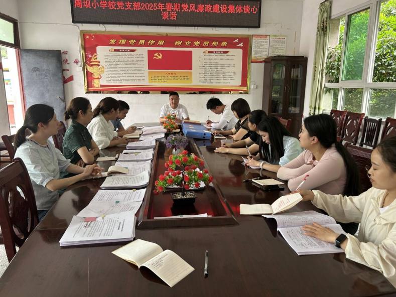 为深入贯彻落实全面从严治党要求,进一步加强学校党支部党风廉政建设工作,提高全体教师的廉洁自律意识。2025年5月13日,江安县夕佳山镇周坝小学校党支部开展了党风廉政建设集中谈心谈话活动,学校全体班子成员和党员教师参加了会议。