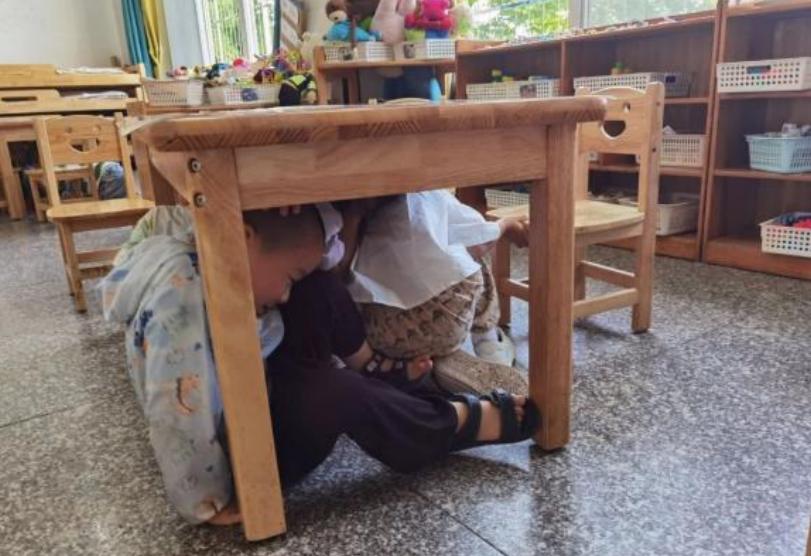 上午10:00警报响起,地震演练开始。孩子们在三江新区罗龙中心幼儿园老师指挥下迅速反应,就近躲到坚固桌下抱头避险。该园教师引导同时逐一检查确保无遗漏。