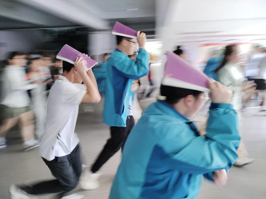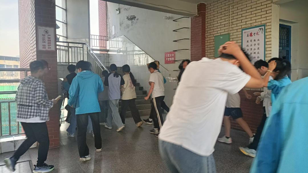 随着第一声警报声骤然响起,演练正式开始。教室内,正在上课的老师们迅速反应,立即指挥学生就近躲避,学生们迅速钻到课桌下,蜷曲身体,用双手、书包等护住头部,安静等待。当第二次警报声响起,全体师生按照预定疏散路线,弯腰低姿、用手或物品护住头部,快速有序地撤离教学楼,向操场安全区域疏散。