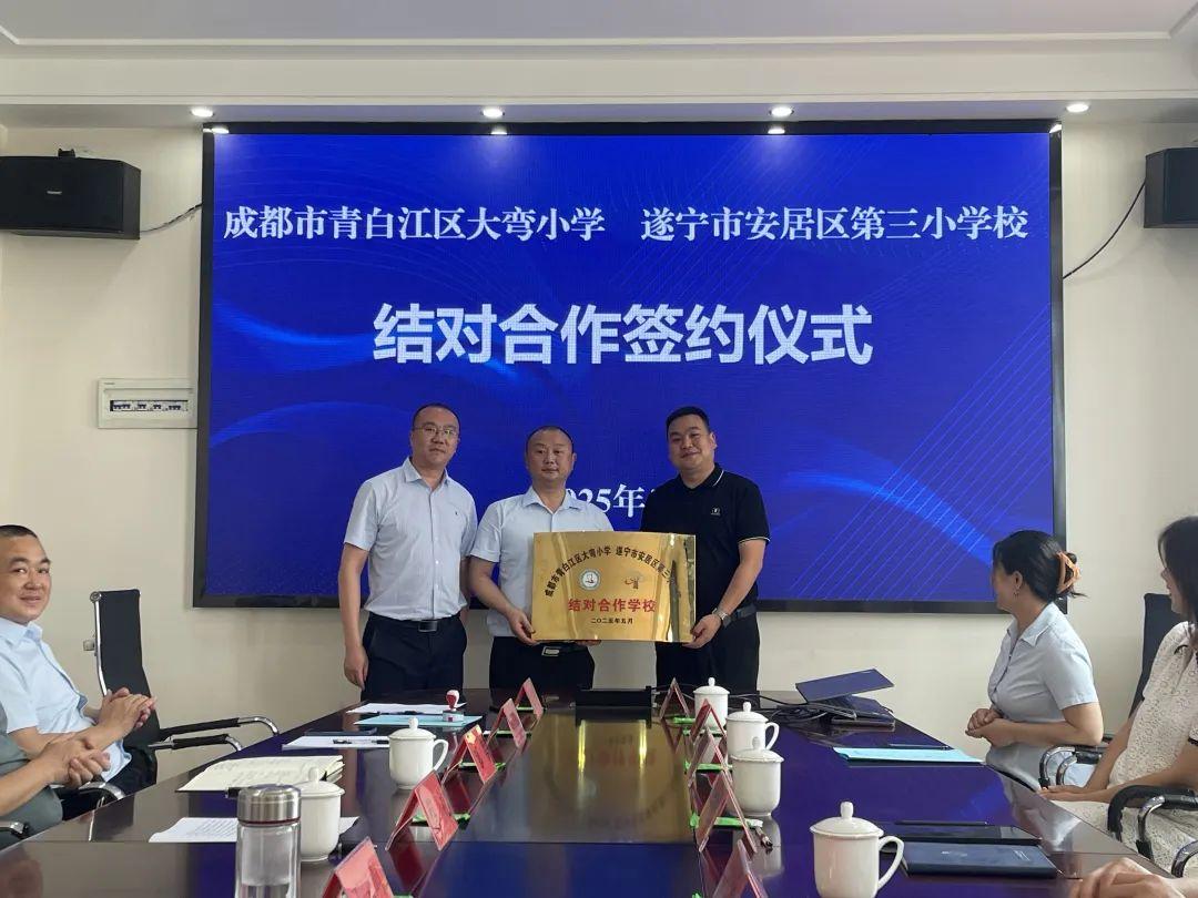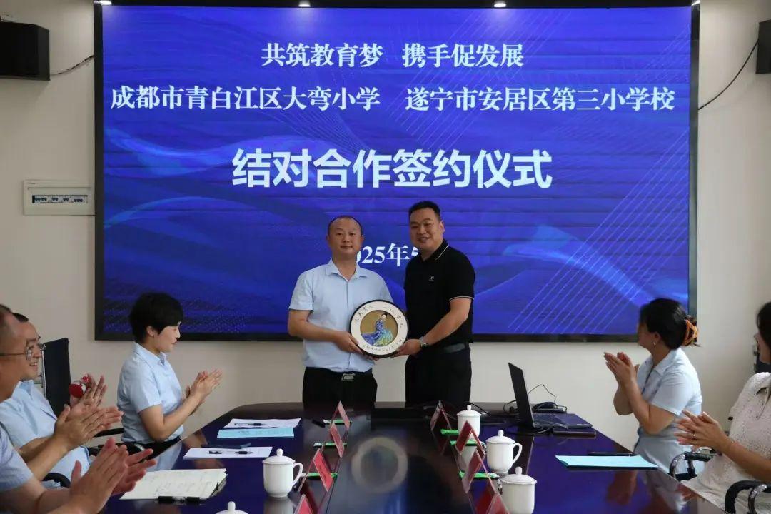 在全体与会人员的见证下,双方校长签署结对合作协议,标志着两校正式开启三年合作征程。随后,副局长蔡礼为两校授“结对合作学校”牌匾,大弯小学向安居三小赠送象征友谊与协作的礼物,传递“美美与共、携手同行”的美好愿景。