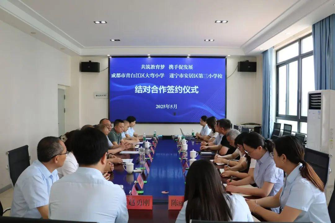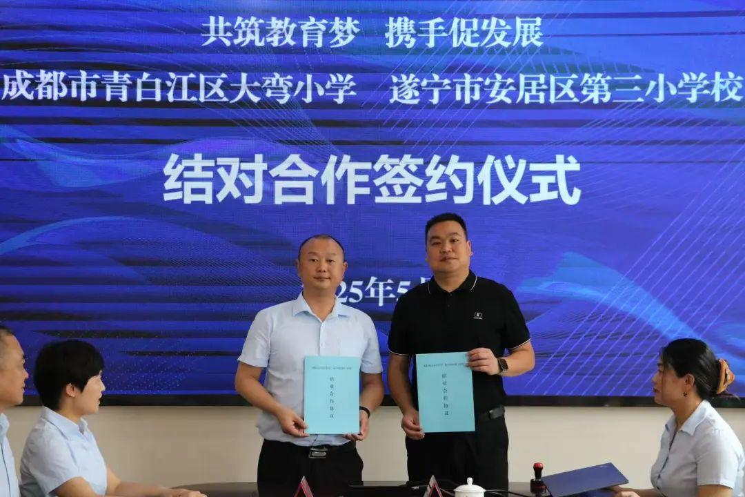 5月14日上午,成都市青白江区大弯小学与遂宁市安居区第三小学校结对合作签约仪式在安居三小举行。大弯小学校长晏世明率四位管理干部,安居区委教育工委委员、区教育局党组成员、副局长蔡礼,区教育局教育股负责人邹攀,安居三小校长王云明及部分行政人员、学科委主任共同出席。仪式由安居三小熊英主任主持。