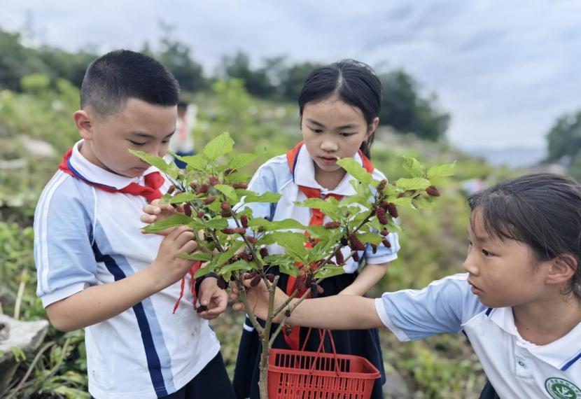 午后,少先队员们提篮踏入桑葚林。紫黑饱满的果实缀满枝头,宛如玛瑙般诱人。大家或踮脚轻摘,或弯腰细选,更有队员迫不及待品尝鲜果,酸甜滋味瞬间点燃山林欢笑。不少队员将“战利品”装入篮中,计划与家人分享这份自然的馈赠。