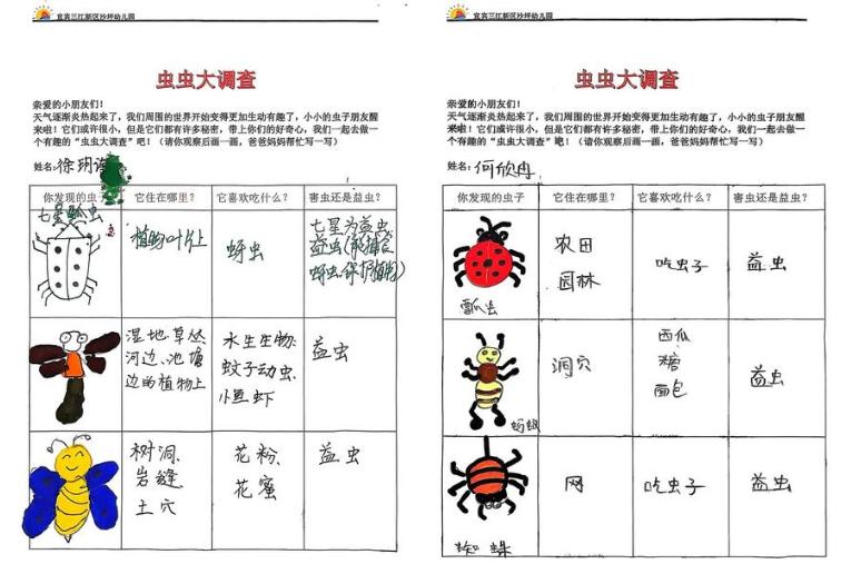 为了更好地激发幼儿的探索兴趣,小朋友们利用周末时间和爸爸妈妈一起查资料、了解昆虫的秘密,昆虫的本领,并把认识的昆虫和爸爸妈妈一起记录到调查表中。快来看看“我们”都调查了哪些昆虫吧!它们都有什么特别本领呢?小朋友们还探索了益虫和害虫。