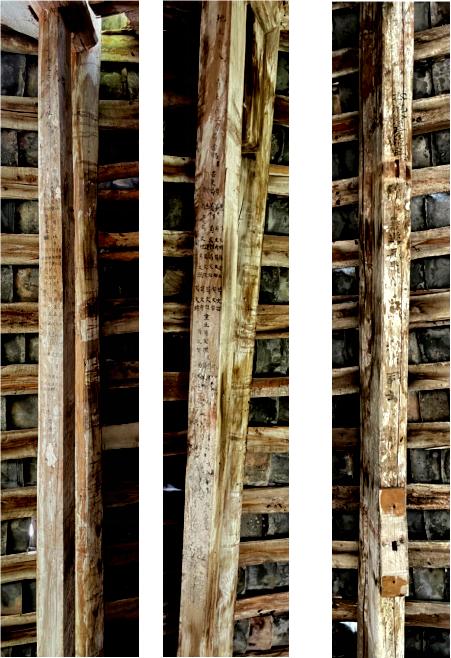 (2)另两根抬梁题记为其他姓氏及遂宁信民几十人等,主要内容均为捐地捐田施财舍房献条石等等,字迹大多模糊不清,此不详述。