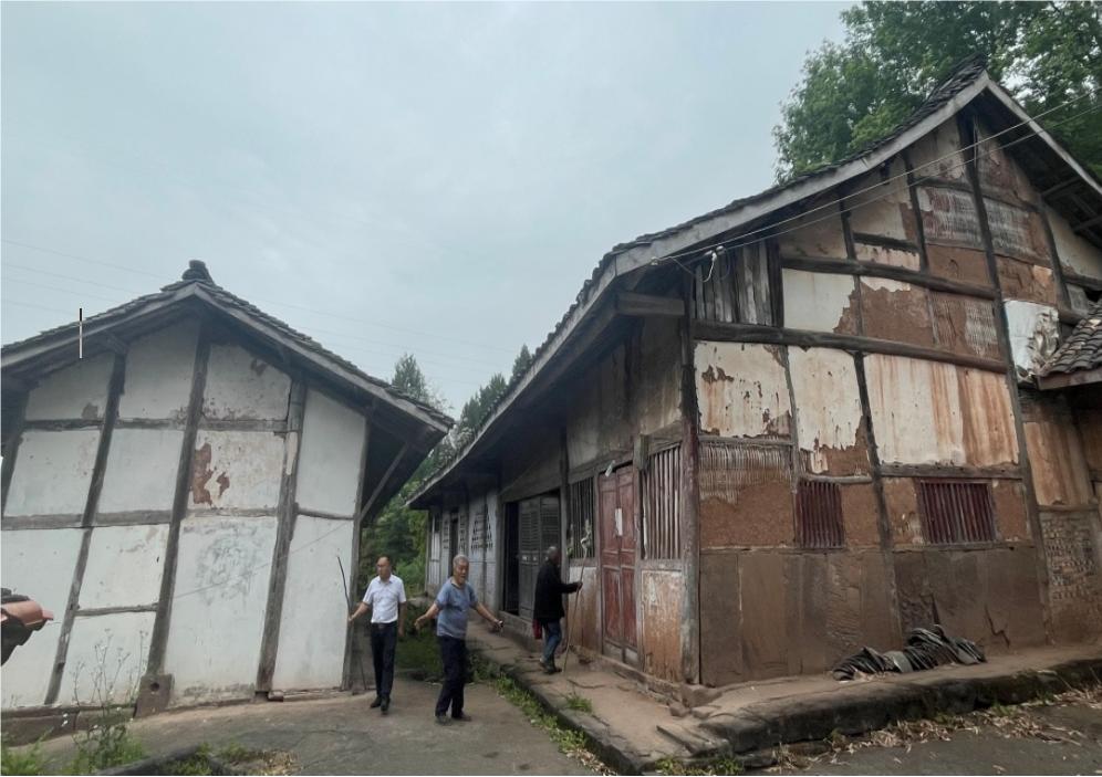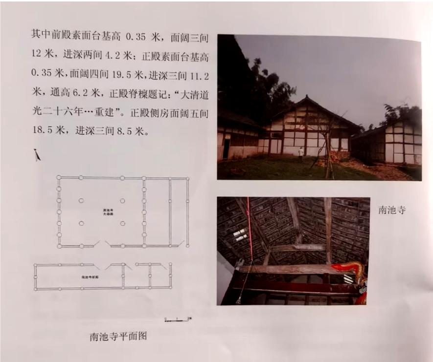 从现场查看,南池寺“正殿侧房面阔五间18.5米,进深三间8.5米。”应为正殿左侧一排呈L形、大门上方写有“上游公社南池寺村小学”的青瓦平房,其房前有长约15米、宽约15米院坝一个。另外,正殿右侧还有一排应为20世纪80年代修建未纳入保护建筑的青瓦平房(现为老年活动室),房前有长约20米、进深约15米左右的院坝一个。