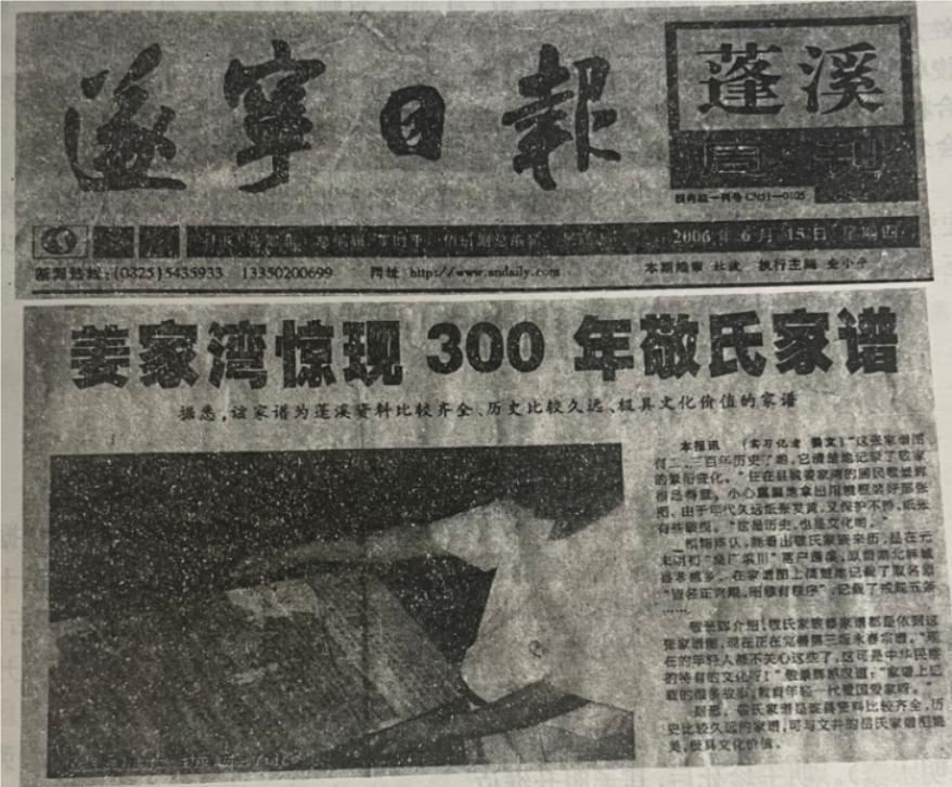 2006年,蓬溪县城姜家湾发现一部清代《敬氏族谱》,从明末清初蓬溪敬氏入川始祖敬永春开始,载时迄今逾300余年,为揭开南池寺梁记苟氏姓名宗源提供了重要的依据。