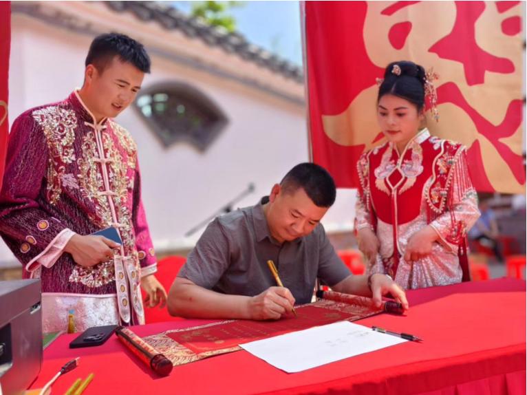 婚礼仪式环节,12对新人依次行三拜礼、合卺礼、结发礼、执手礼,传统礼仪庄重而典雅,尽显中式婚礼的独特韵味。县民政局负责人现场为新人证婚,颁证嘉宾集体颁发传统婚书,为新人的幸福婚姻送上官方祝福与见证。新人代表还走上台前,分享甜蜜爱情故事,并带来精彩的才艺展示,将现场氛围推向高潮。