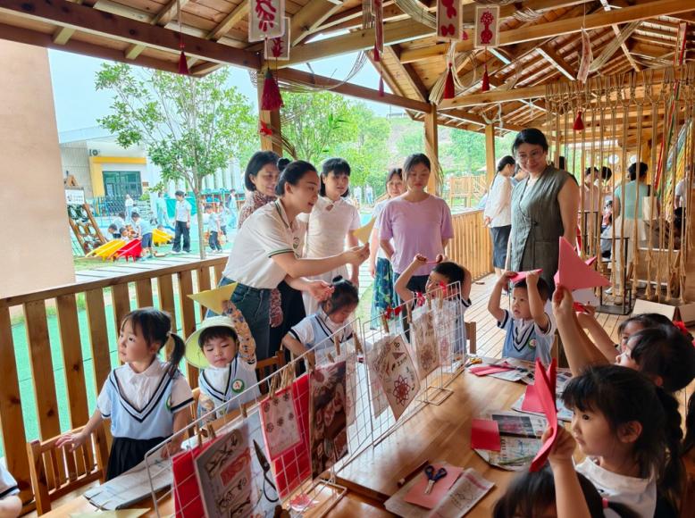 活动现场精心布局了12个主题游戏区,巧妙地将“五育”目标融入其中。在健康福区域,幼儿们在体能大循环区勇敢挑战翻越“安吉雪山”,野战营中“红军小勇士”突围战紧张刺激,孩子们在运动中锻炼了体魄,培养了勇敢坚毅的品质。聪慧福区域,沙水区的寻宝任务吸引了各年龄段幼儿的积极参与,他们共同合作破解地图密码,在探索中提升了观察力和思维能力。文明福区域,国风文化长廊中幼儿们专注下棋对弈,在游戏中传递着规则意识,感受着传统文化的博大精深。艺美福区域里,非遗工坊热闹非凡,大班幼儿耐心指导中班、小班伙伴编竹篮、绣福字,剪窗花,让非遗文化在孩子们手中焕发出新的生机。勤劳福区域,农家小院中混龄小组的孩子们分工协作,自制“煎麦粑”,随后化身外卖小骑手将美食送给观摩教师品尝,体验到了劳动的乐趣和分享的快乐。