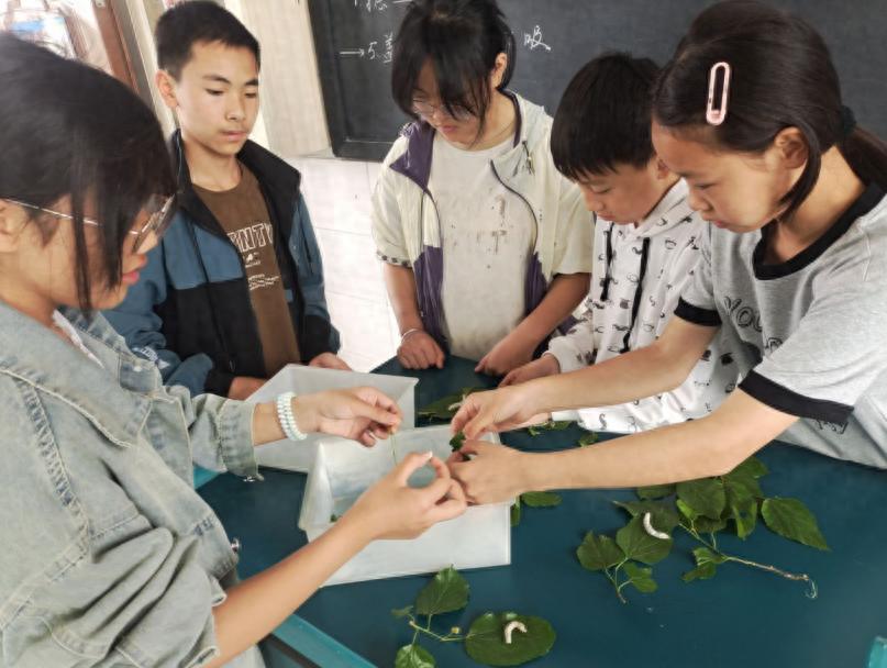 江安县第一初级中学校学生按班级分组每日轮流喂养、清理蚕沙,定期测量蚕体长度并记录数据。通过养蚕活动,学生学习蚕的生理特性、生命周期等科学知识,参与采桑喂蚕、清理蚕室等劳动过程,更好实现理论与实践的深度交融。