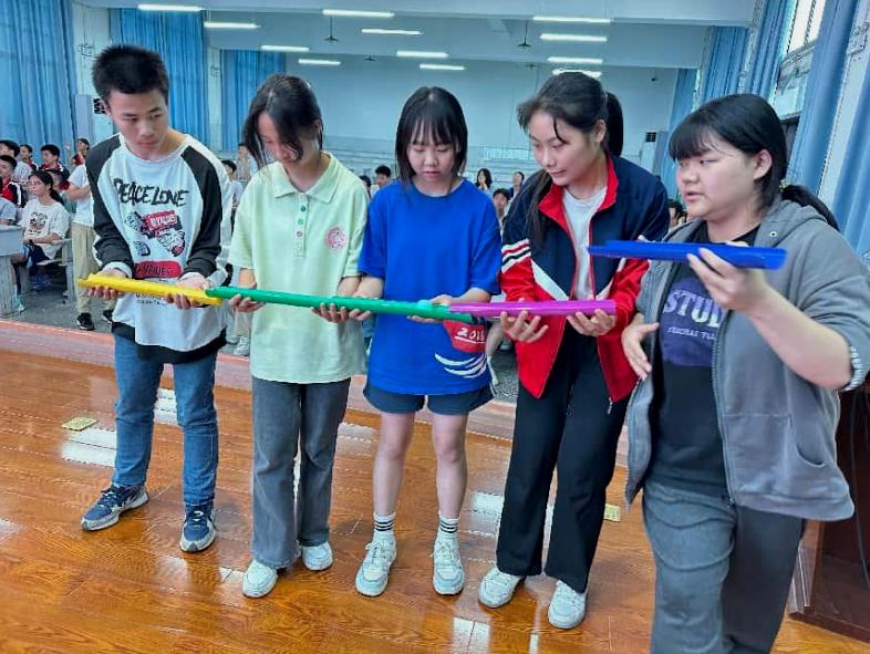 南溪区第四中学校同学们在陈燕老师的带领下,迅速投入到了游戏中。“球行万里”环节中,5人一组默契配合,用PVC管搭建“轨道”,让乒乓球顺利传递至终点。比赛中,队员们全神贯注,欢声笑语不断,最终用时最短的两组获得了精美奖品。随后的“筷子夹球”挑战更是紧张有趣,同学们用筷子夹起乒乓球快速传递,既考验手眼协调,又锻炼团队协作能力。现场气氛热烈,该校同学们在竞争中感受到合作的力量,压力也随之消散。