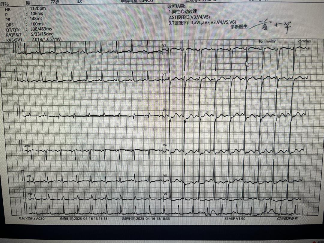 转入 ICU 后,心电监护提示 "8+2" 现象 —— 急性心肌梗死确诊!ICU 团队 24 小时不间断监测,为介入手术争取黄金时间。