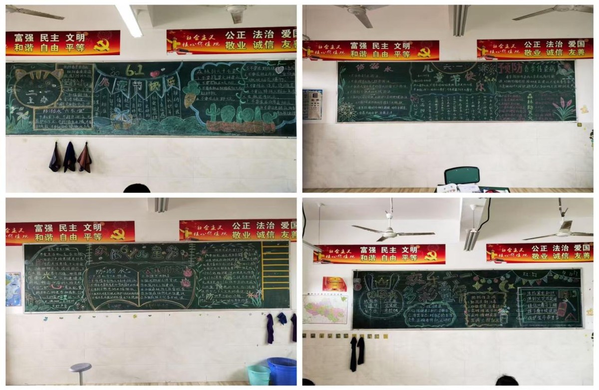 本次评比围绕班级文化布置与黑板报设计两大板块展开。班级文化布置涵盖班级公约、荣誉展示、学生作品墙、阅读角、卫生角等区域,体现班级特色与学生个性;黑板报则涵盖“庆祝六一”、“防溺水”、“心理健康”、“森林防火”、“传染病防控”等板块,从内容丰富度、版面设计、书写规范等维度进行考量。评比小组秉持公平公正原则,深入各班级实地考察打分。