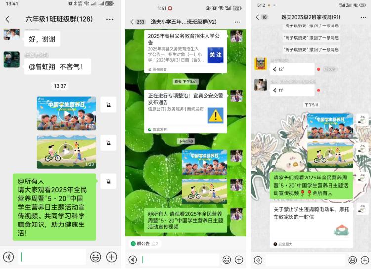 同时,高县逸夫小学校积极拓展宣传渠道,精心挑选并制作了一系列食品安全与营养健康宣传视频,通过班级群进行推送。视频内容涵盖合理膳食搭配、规律用餐、健康运动、科学饮水等知识,以生动形象的动画演示、通俗易懂的语言讲解,帮助学生和家长轻松掌握健康饮食要点,实现家校宣传全覆盖,营造浓厚的食品安全与营养健康氛围。