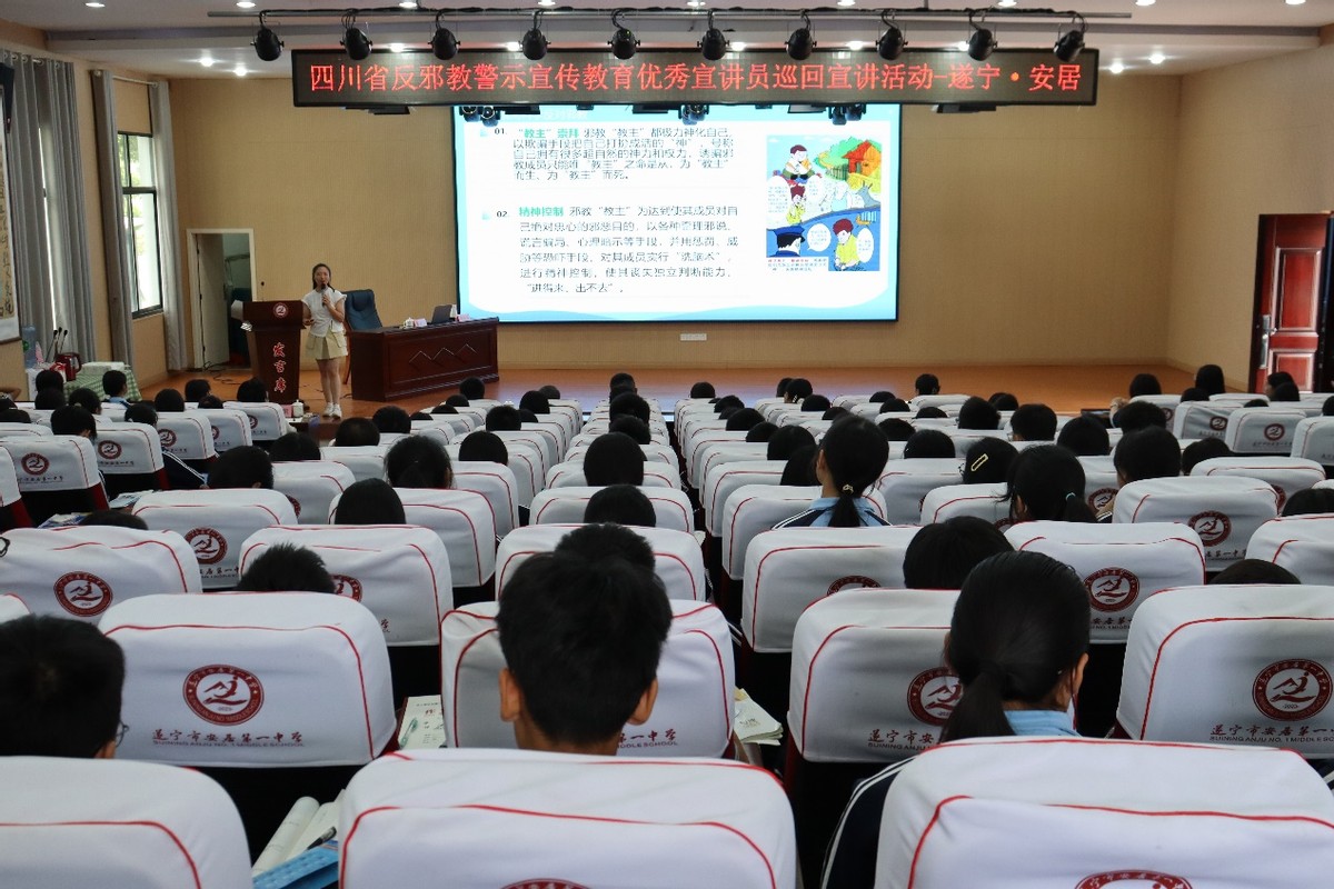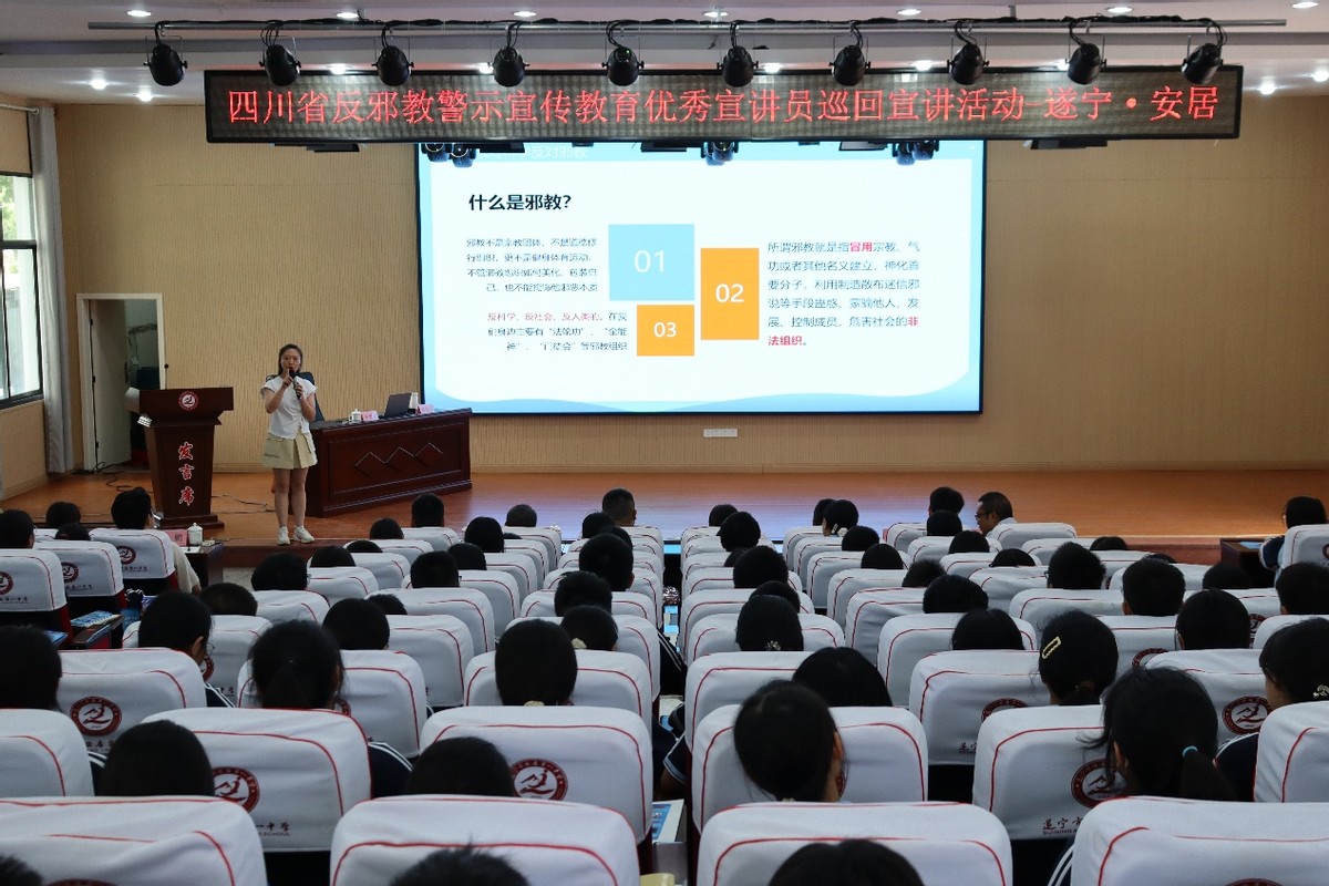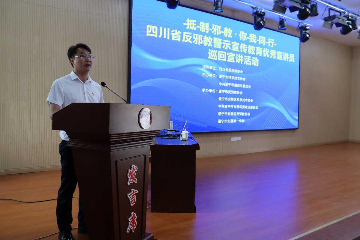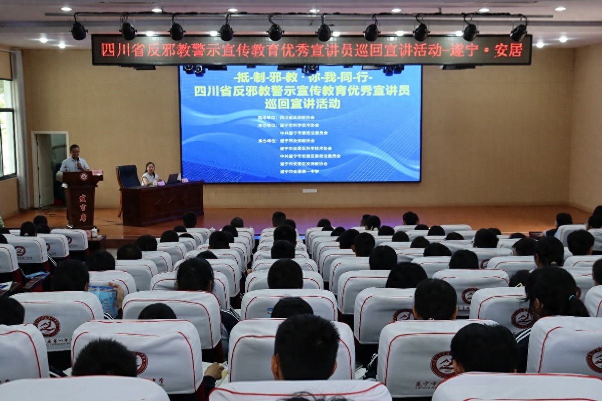 为进一步增强广大师生识别邪教、抵制邪教的能力,营造崇尚科学、反对邪教的校园文化氛围,2025年5月23日,由遂宁市科学技术协会、中共遂宁市委政法委员会联合主办的“四川省反邪教警示宣传教育优秀宣讲员巡回宣讲活动”走进安居一中,为师生们带来了一堂生动的反邪教警示教育课。四川省反邪教协会秘书长、办公室主任周世英,省反邪教协会办公室职员陈晓莉,遂宁市科协副主席田茫等领导出席活动,活动由学校政教处副主任唐强主持。