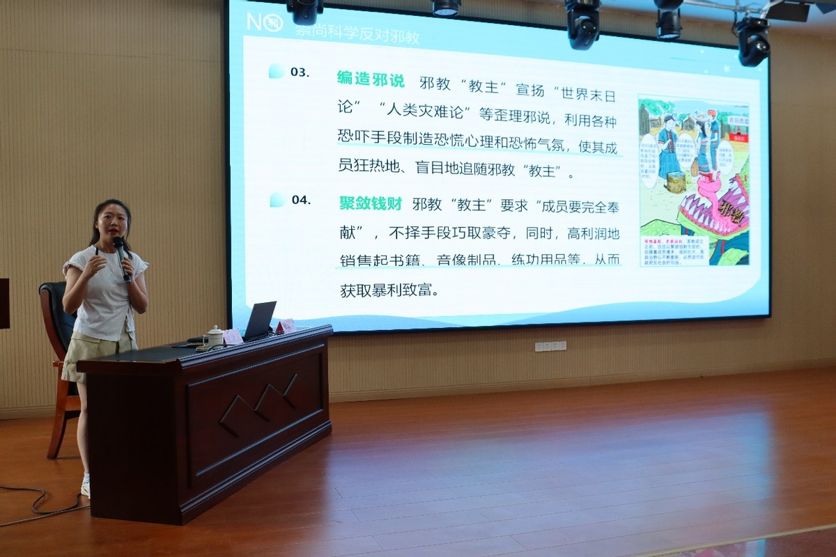 随后,2024年全省首届反邪教宣讲大赛“十佳宣讲员”,四川省井研县公安局政治安全保卫大队教导员,一级警长黄婉佳以《青春无邪 护航成长》为题,为师生们带来了一场精彩的宣讲。她结合真实案例,从邪教的危害、传播特点、欺骗手段及社会影响等方面展开深度剖析,帮助师生认清邪教本质。